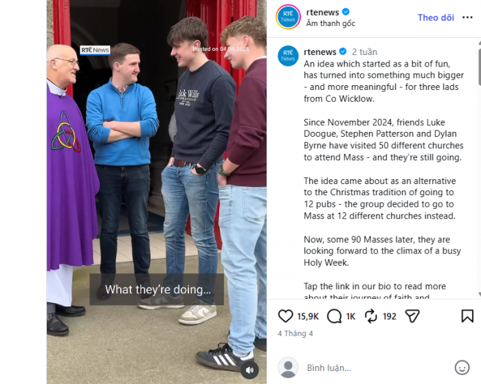 Theo một video gần đây của RTE News, điều bắt đầu như một lựa chọn vui vẻ thay thế cho một truyền thống lễ hội quen thuộc đã trở thành điều lớn lao hơn đối với ba người bạn đến từ hạt Wicklow, Ireland. Thay vì tham gia “12 quán rượu dịp Giáng Sinh” như thường lệ, Luke Doogue, Stephen Patterson và Dylan Byrne đã quyết định làm điều khác biệt: tham dự Thánh Lễ tại 12 nhà thờ khác nhau.