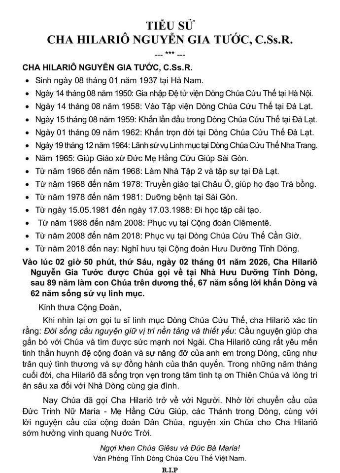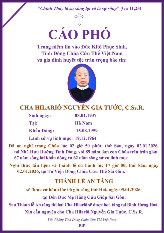 Cáo phó: Cha Hilariô Nguyễn Gia Tước, C.Ss.R Dòng Chúa Cứu Thế, NHÀ DÒNG & GIÁO XỨ, VỀ NHÀ CHA Share Facebook Twitter Pinterest