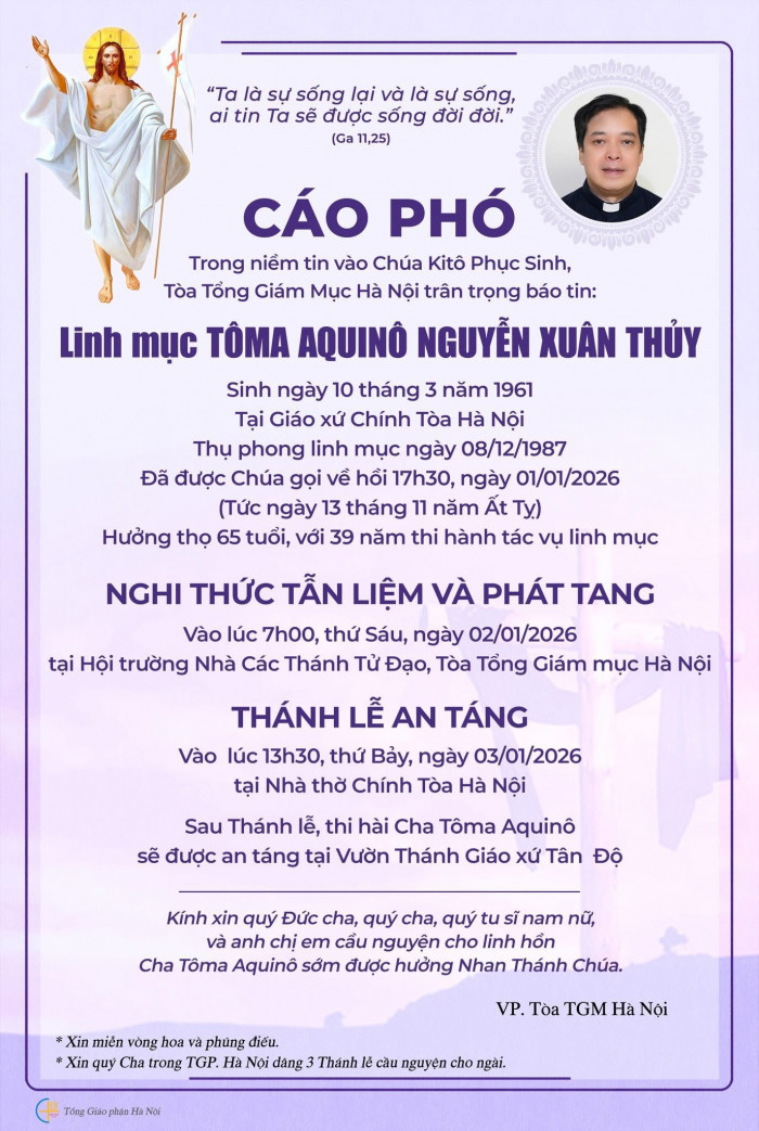 Cáo phó: Cha Tôma Aquinô Nguyễn Xuân Thủy, Tổng giáo phận Hà Nội VỀ NHÀ CHA Share Facebook Twitter Pinterest