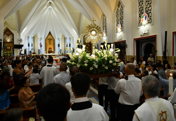 Cha Martin Vũ Đồng Tùng, thành viên Cộng đoàn Dòng Chúa Cứu Thế Sài Gòn hướng dẫn. Quý cha, quý thầy, các chú Dự tập và Đệ tử của Dòng, các em lễ sinh trong Giáo xứ và bà con giáo dân bắt đầu cuộc cung nghinh Thánh Thể quanh Tu viện và nhà thờ Giáo xứ. Đoàn rước với nến sáng trong tay, cung nghinh Bí Tích Thánh Thể trong bàu khí sâu lắng, thánh thiêng.