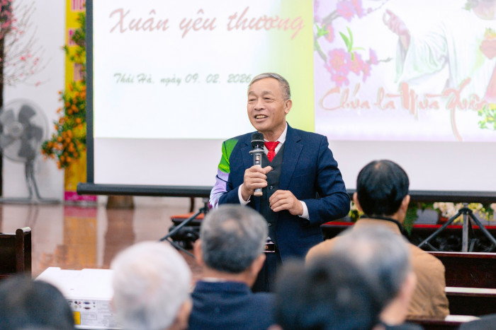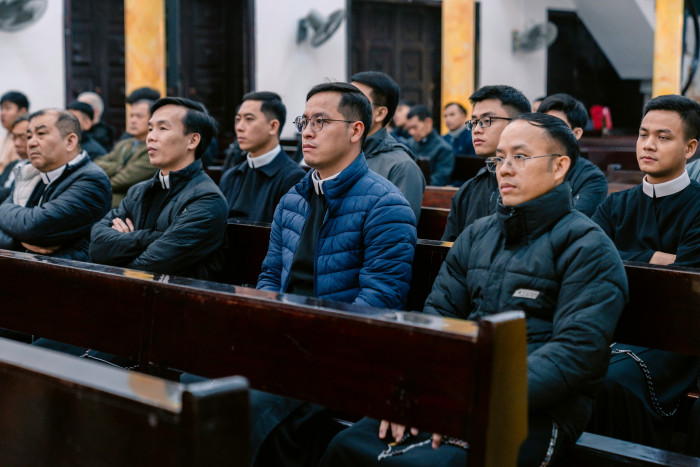 Ngay từ 8 giờ sáng, khuôn viên tu viện rộn ràng niềm vui đón tiếp. Quý cha, quý thầy, quý chú và thân nhân từ nhiều nơi quy tụ về Thái Hà trong bầu khí thân tình, ấm áp như một đại gia đình. Những cái bắt tay, những nụ cười và lời thăm hỏi đầu xuân làm cho ngày gặp gỡ mang đậm nét gia đình – gia đình của ơn gọi, của tình hiệp thông trong Chúa.