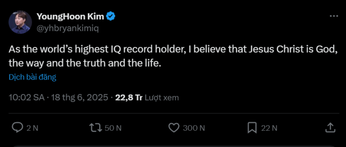 Lời tuyên xưng đức tin của Younghoon Kim – người đang nắm giữ kỷ lục IQ cao nhất thế giới – đã lan truyền mạnh mẽ và đang truyền cảm hứng cho hàng triệu người.