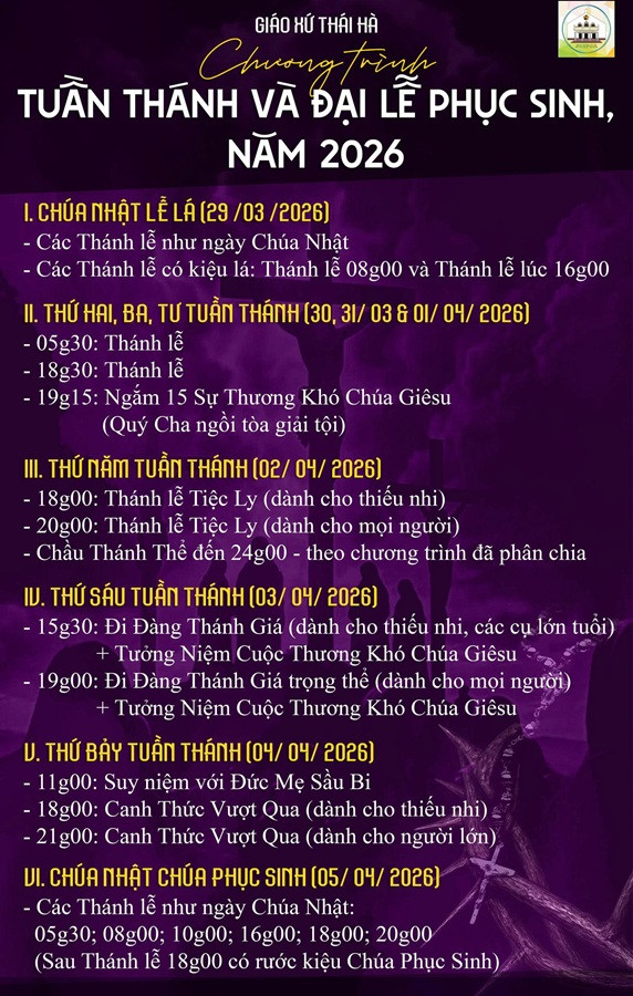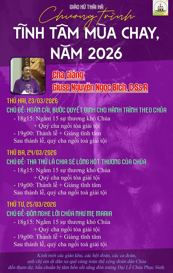 Dưới đây là chương trình Tĩnh Tâm Mùa Chay diễn ra trong ba ngày, Thứ Hai, Ba, Tư (23,24,25/3/2026) và Tuần Thánh cũng như Đại lễ Chúa Phục Sinh năm nay. Kính mời ông và và anh chị em sắp xếp công việc để đến tham dự.