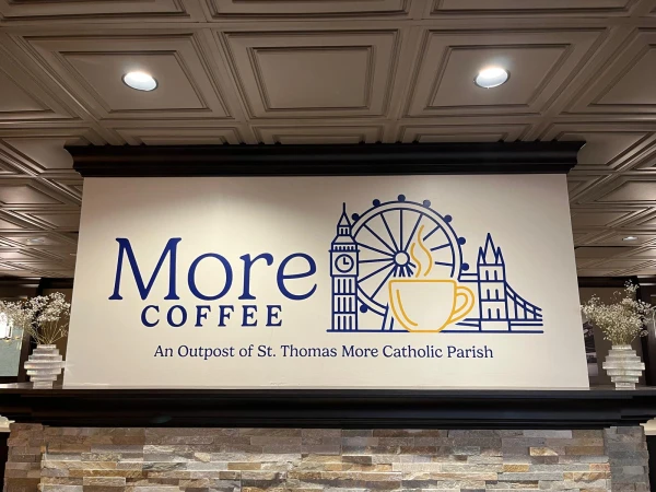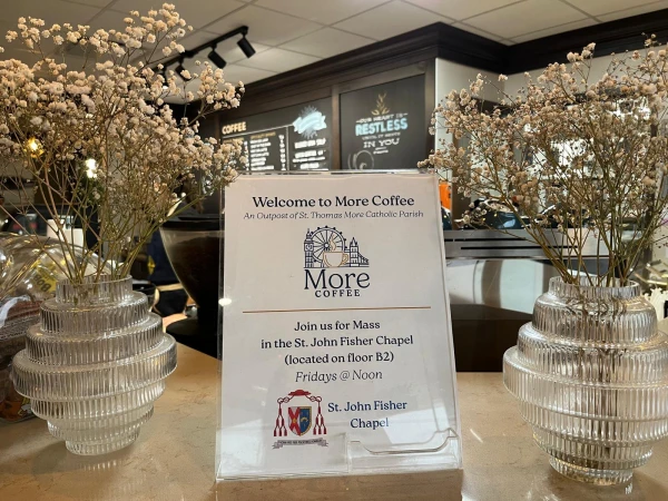 Bước vào quán More Coffee, bạn sẽ lập tức được đón chào bởi hương cà phê rang xay thơm lừng, những bức ảnh cổ điển về đường chân trời London treo trên tường, những trích dẫn của các thánh Công giáo viết trên bảng phấn, và một cây thánh giá được treo cạnh quầy phục vụ.