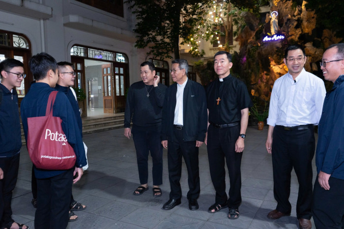 Tiếp đón Đức cha Phêrô và Đức cha Giuse có cha Giuse Nguyễn Văn Hội, Bề trên chính xứ, một số cha trong Tu viện, Hội đồng Mục vụ Giáo xứ Thái Hà.