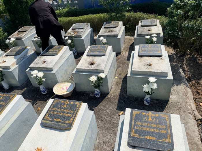 Điểm đến tiếp theo là nghĩa trang giáo xứ Bình Cách, nơi an táng 3 nghìn thai nhi vô tội. Dừng lại nơi đây chúng tôi cảm nhận được sự vất vả của nhóm vì chỉ có 2 thành viên thường trực lo lắng chăm sóc phần mộ. Cha đặc trách động viên các chị thật nhiều, mong sao các chị cố gắng trong công việc và mời gọi thêm người cùng cộng tác.