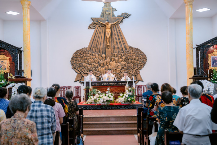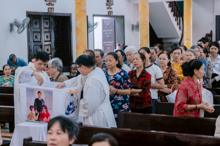 Sau nghi thức Xức Dầu, vào lúc 9 giờ 30, cộng đoàn bước vào Thánh Lễ tạ ơn do cha Giuse Lương Thanh Tùng chủ tế. Cha Giuse Vũ Văn Tuấn chia sẻ Lời Chúa, mời gọi cộng đoàn chiêm ngắm hình ảnh Thánh Giê-ra-đô – người đã sống trọn vẹn tình yêu phục vụ trong khiêm hạ, hiến dâng cuộc đời để chăm sóc người nghèo, người bệnh và những ai đang gặp khổ đau.